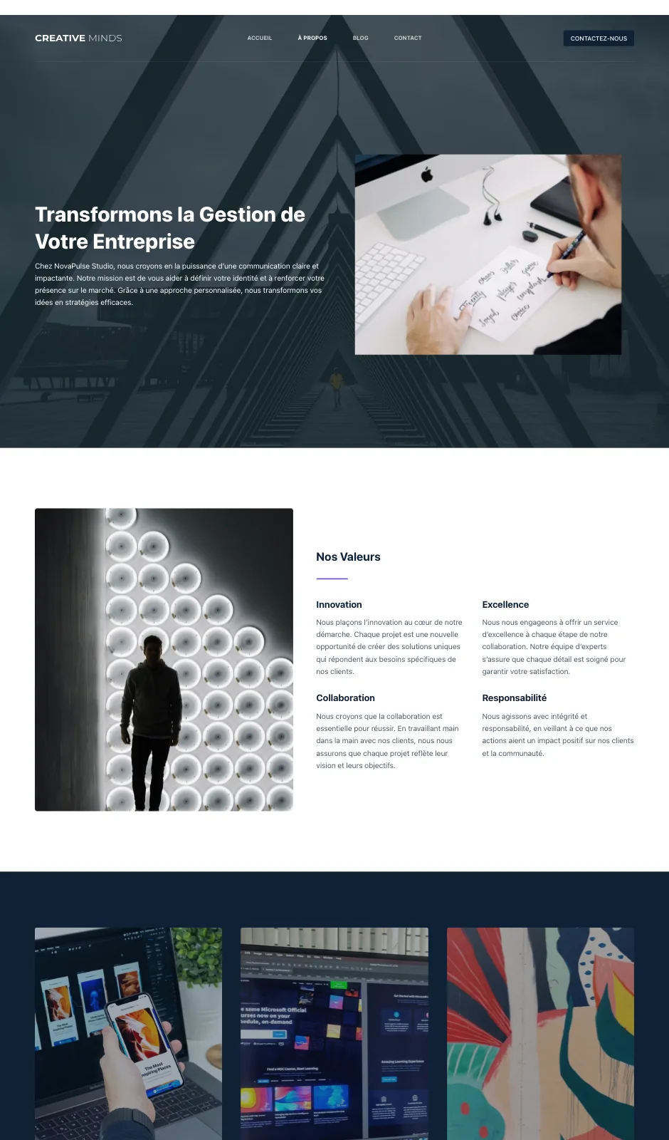 La page À propos met en lumière les valeurs de votre entreprise et l'équipe qui se cache derrière vos succès, ajoutant une touche humaine et inspirante à votre présentation. De plus, vous pouvez tenir un blog pour partager vos expertises et les tendances du secteur, renforçant ainsi votre autorité dans votre domaine.