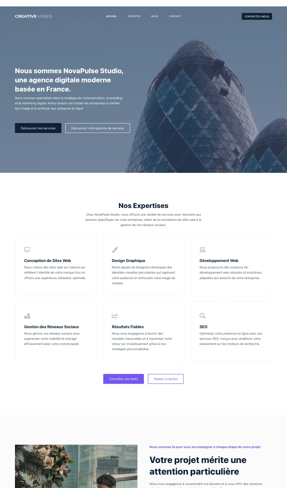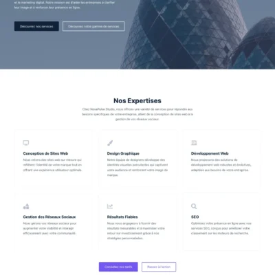" Pour les agences aux multiples talents " est un modèle polyvalent et efficace, parfait pour mettre en valeur vos nombreuses compétences et simplifier les interactions avec vos visiteurs. Simple, mais puissant !