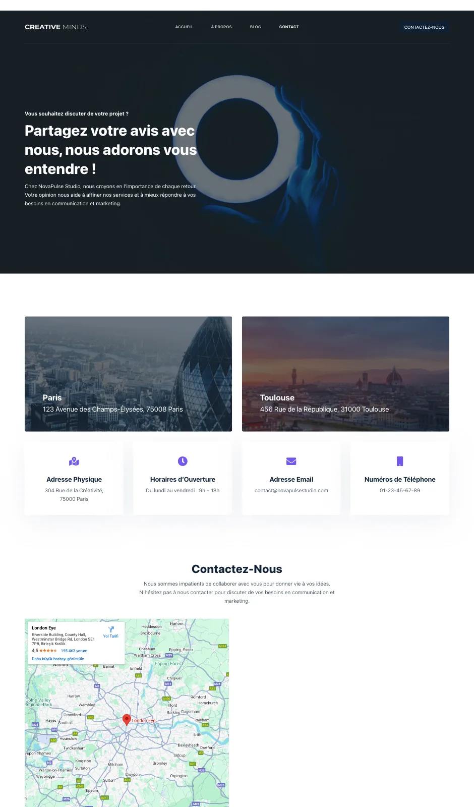 Enfin, la page Contact est conçue pour faciliter les prises de rendez-vous ou les demandes d'informations, garantissant une connexion rapide avec vos clients potentiels.