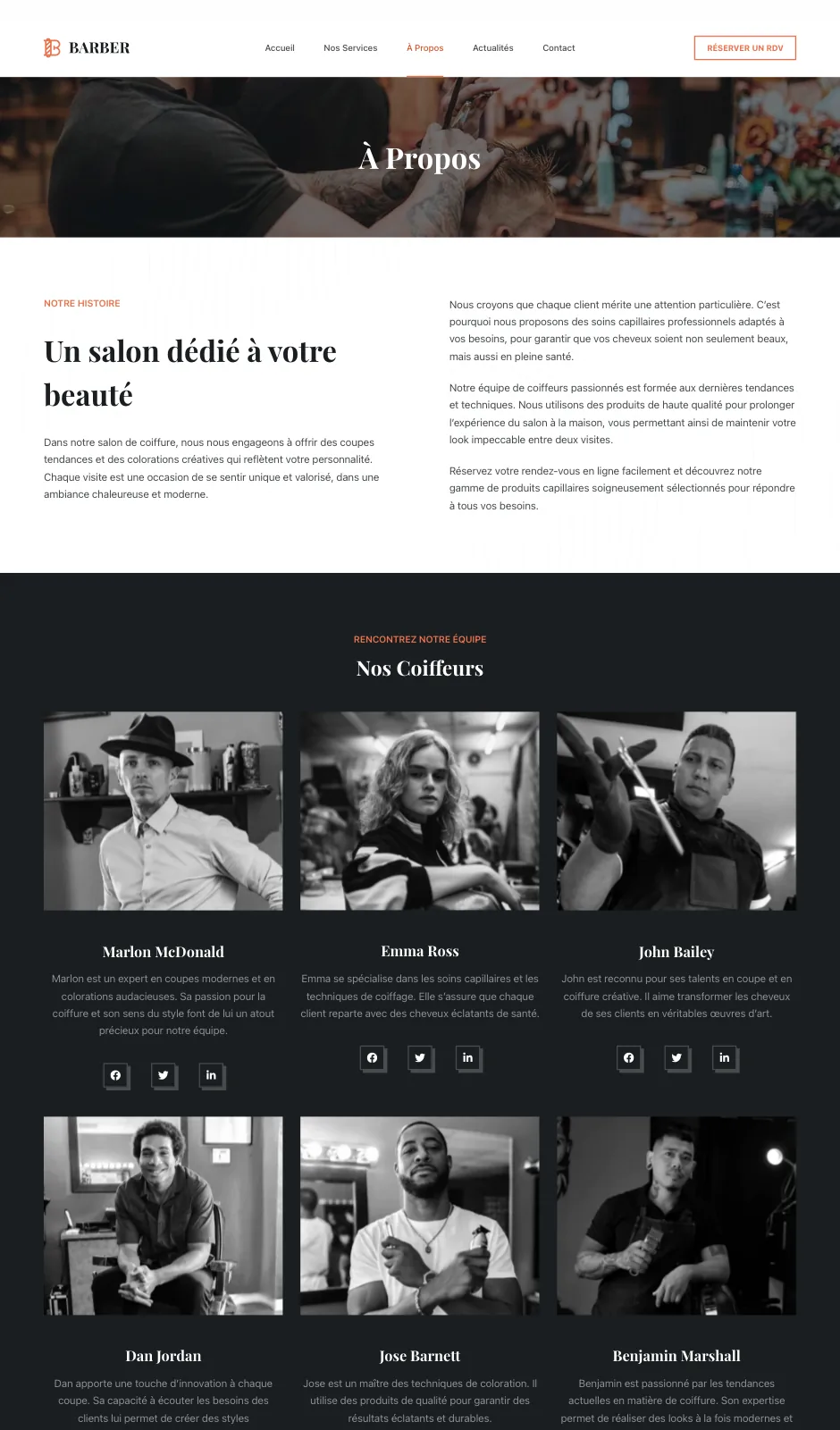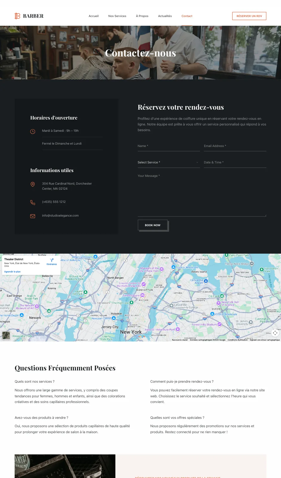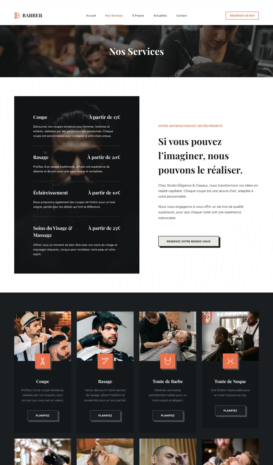 La page Services permet à vos clients de découvrir facilement les prestations que vous proposez, des coupes classiques aux transformations les plus audacieuses. La page Contact leur permet de réserver leur prochain rendez-vous en quelques clics seulement, garantissant une expérience fluide et sans tracas.