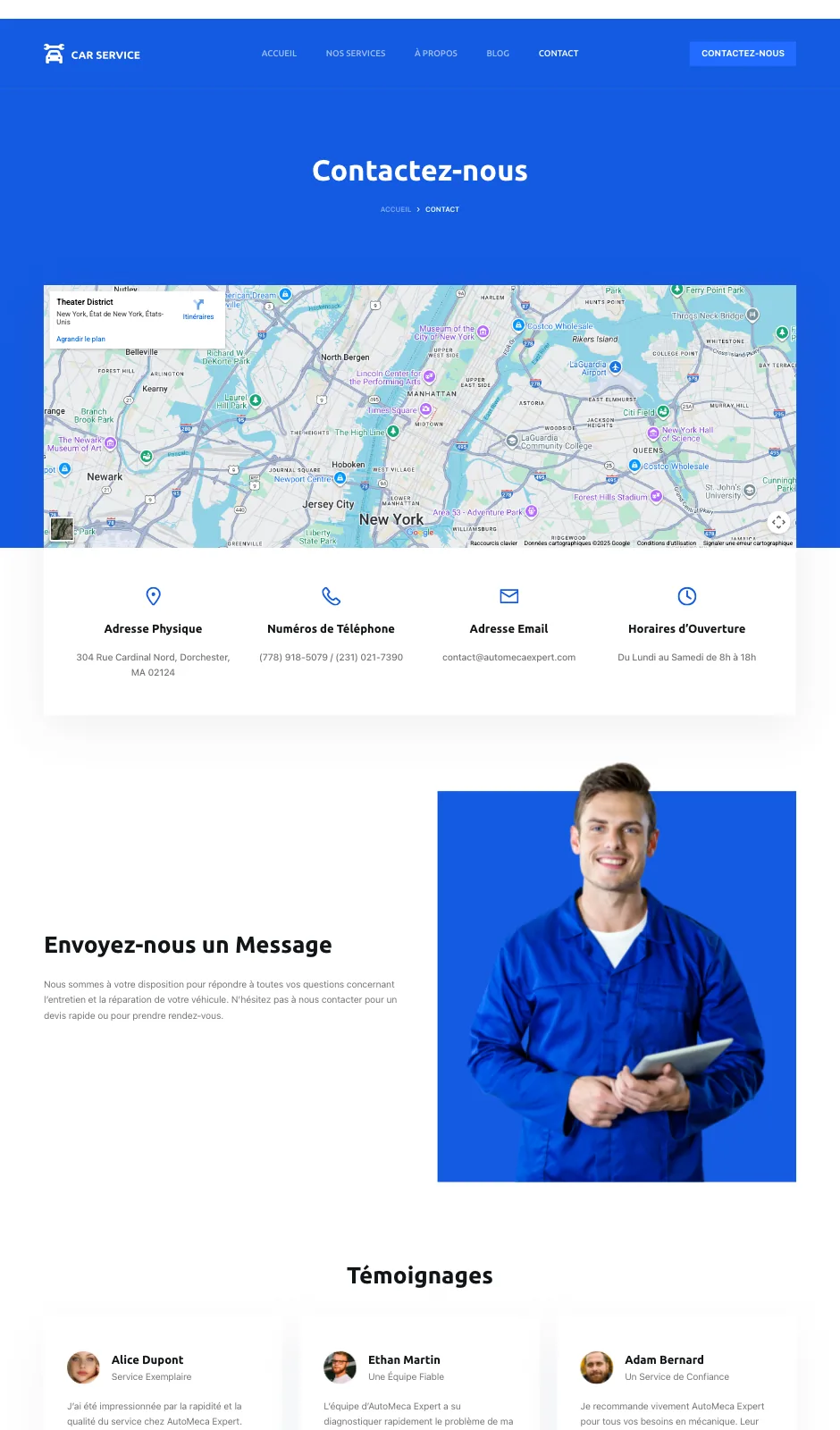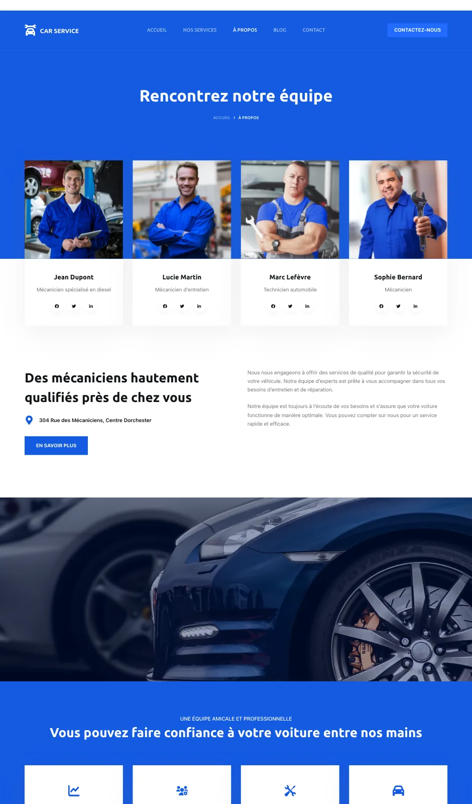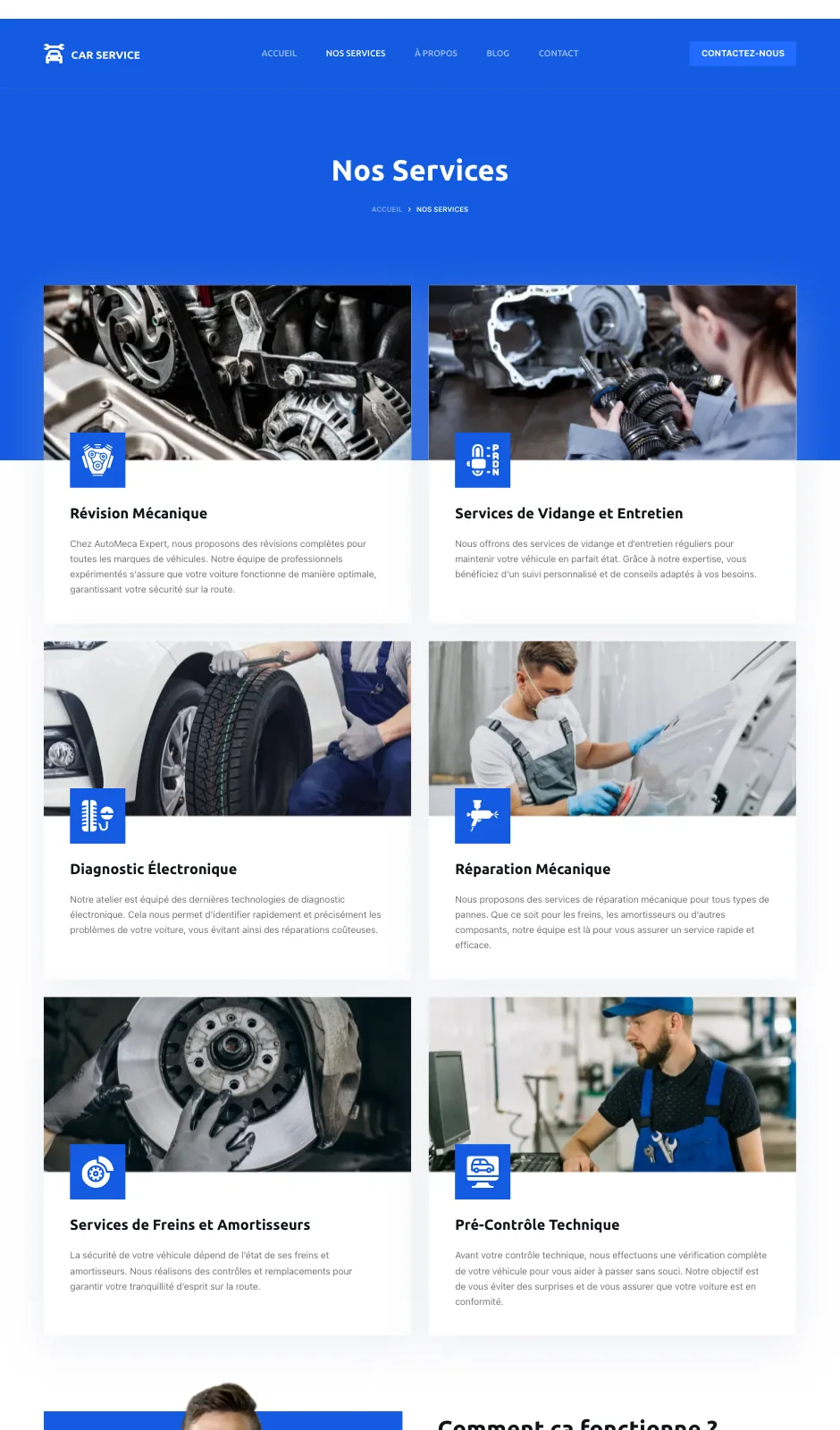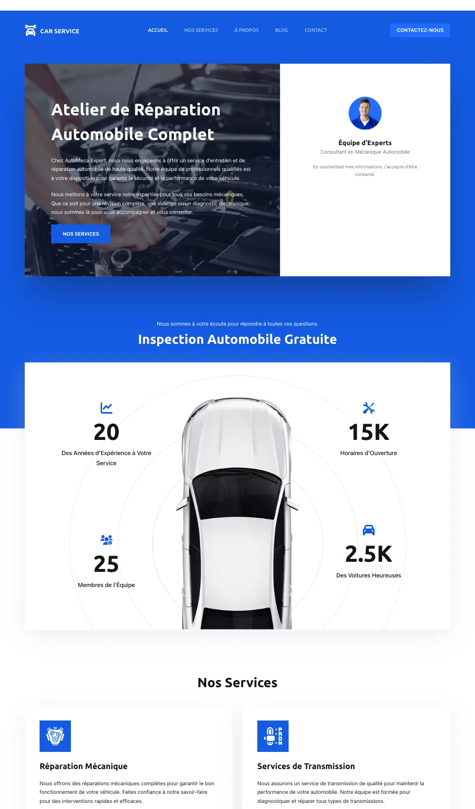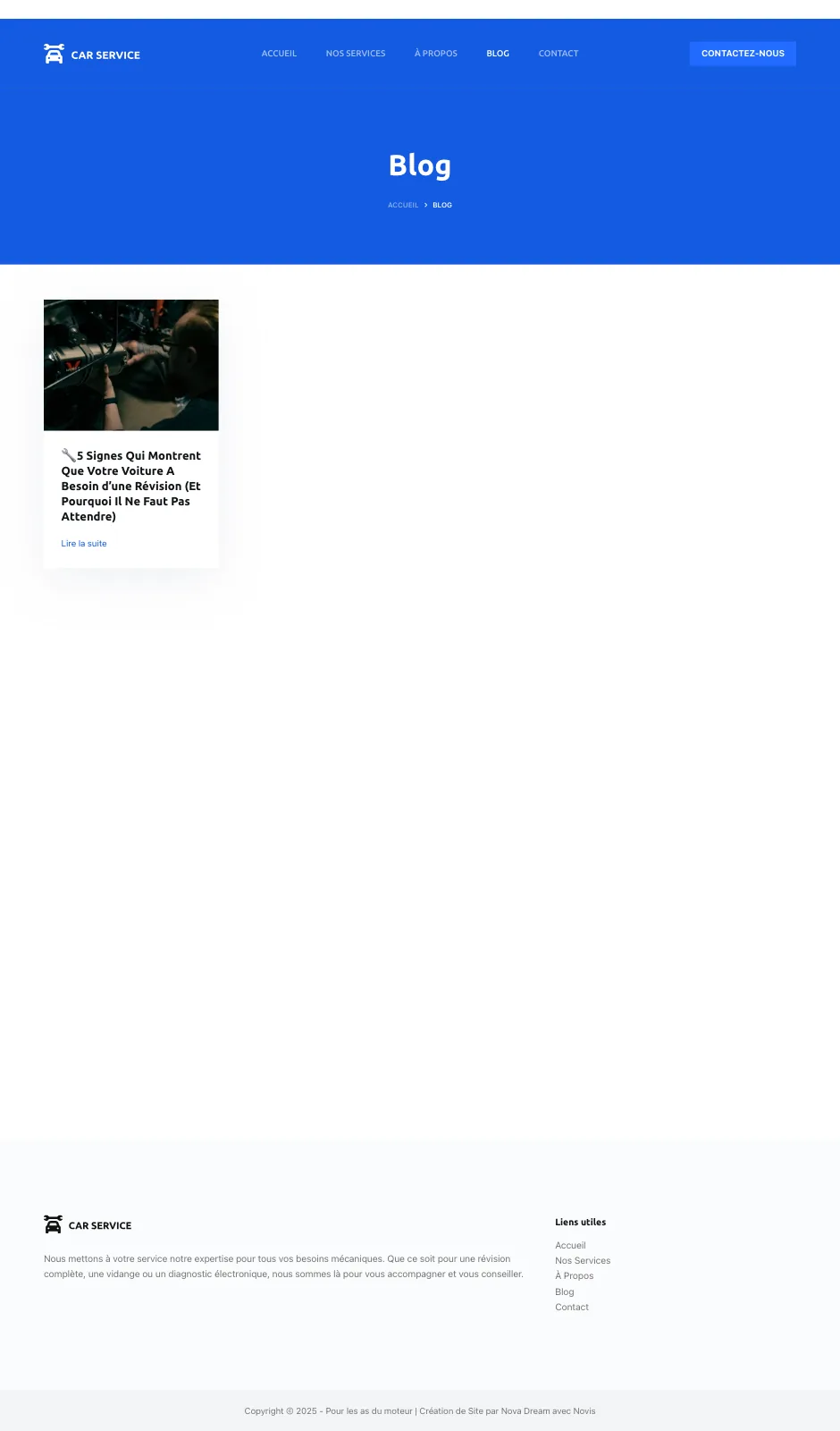 Une page Blog vous permet de tenir vos clients informés des dernières nouveautés du secteur automobile, des astuces d’entretien aux nouvelles technologies, renforçant ainsi votre expertise et leur fidélité. Et parce qu'un site web doit être aussi fluide que les véhicules que vous entretenez, la navigation est claire et épurée, pour que chaque visite soit un véritable plaisir.