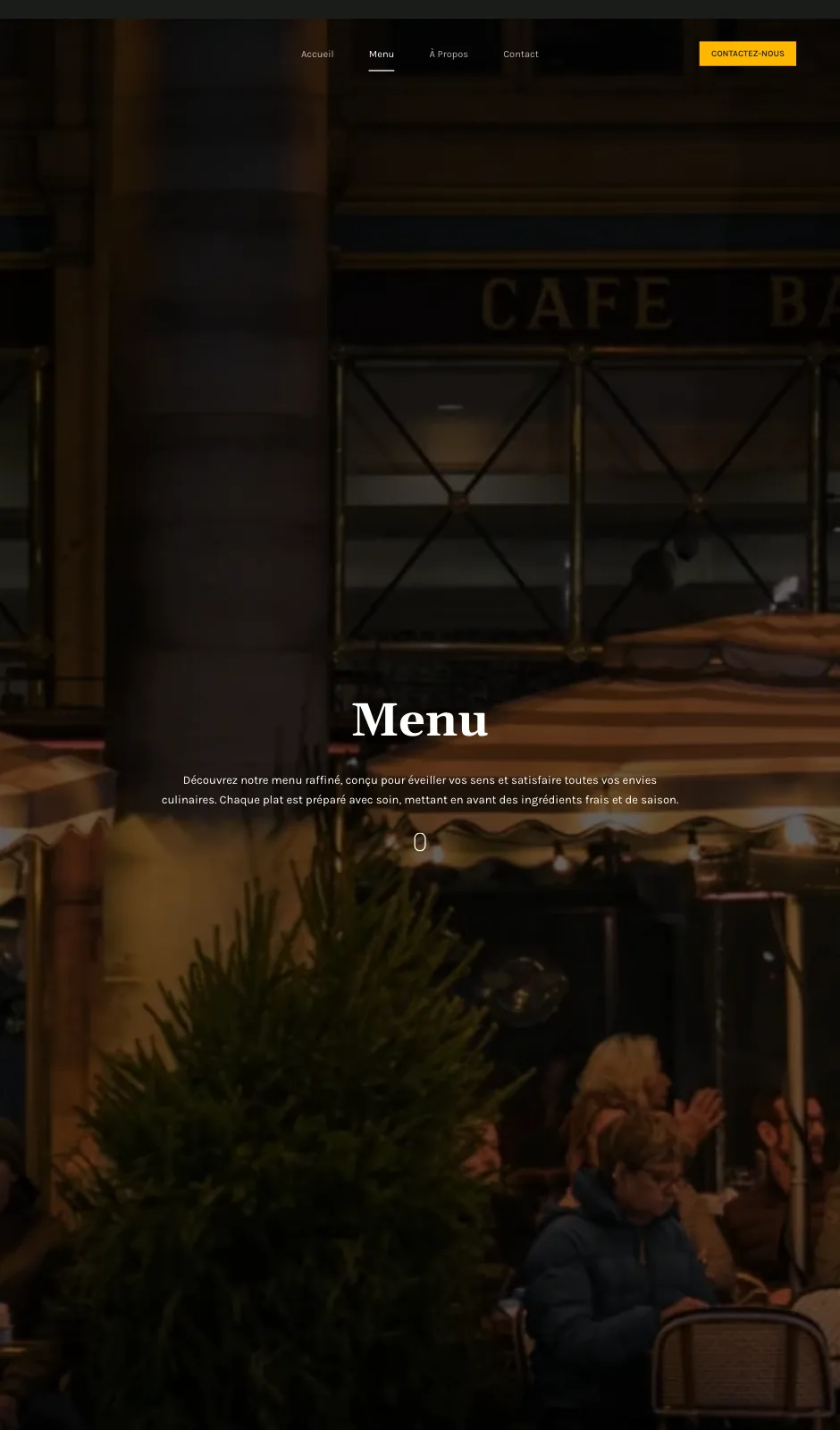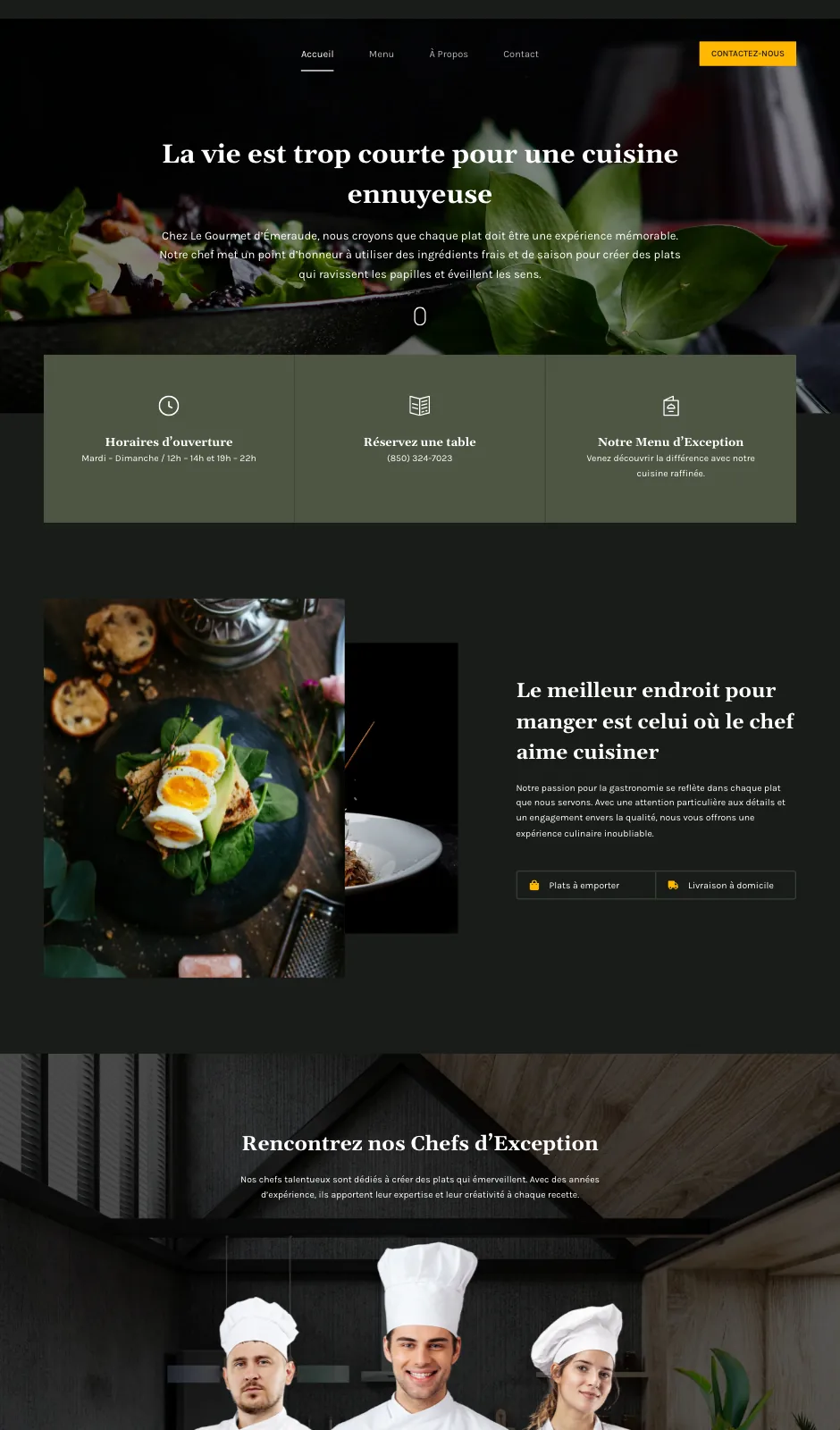La page d’accueil sert d'entrée délicate pour séduire vos visiteurs dès le premier regard. Elle est suivie d'une galerie alléchante qui, à la manière d'un buffet visuel, dispose vos plats sous forme de grilles raffinées, captivant l'attention avec une mise en page élégante et colorée.